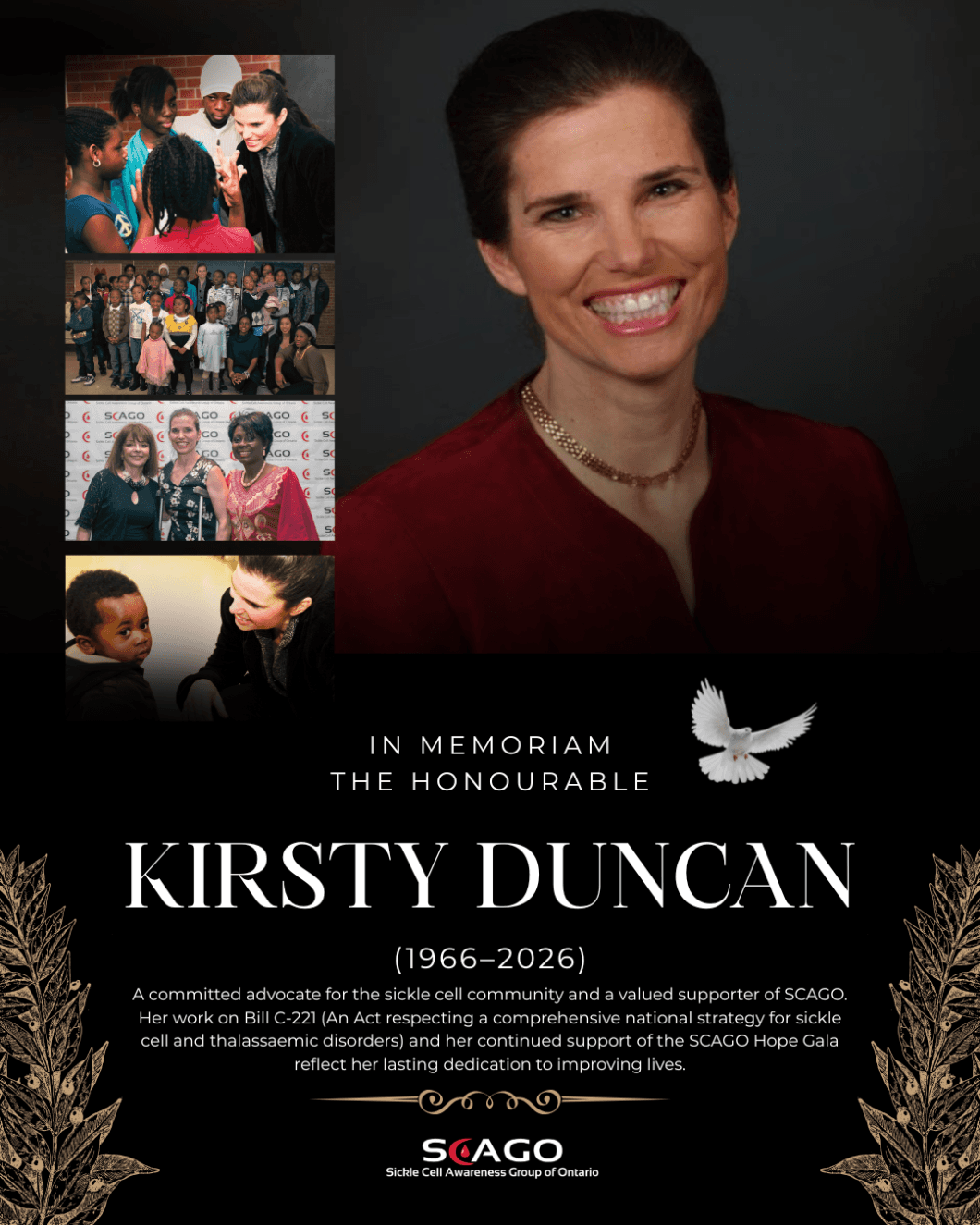 SCAGO remembers and honours The Honourable Kirsty Duncan, whose advocacy and unwavering support for the sickle cell community left a lasting impact. During the 41st Parliament, she re‑introduced Bill C‑605 as Bill C‑221, advancing a national strategy for sickle cell and thalassaemic disorders. Her work helped elevate the voices of patients, families, and advocates, strengthening the call for coordinated national action. Beyond Parliament, Kirsty showed her commitment through presence, never missing a SCAGO Hope Gala and standing with our community in solidarity, compassion, and hope. Her dedication, allyship, and belief in equity will continue to inspire us. Thank you, Kirsty, for walking alongside the SCAGO community. Your legacy lives on.